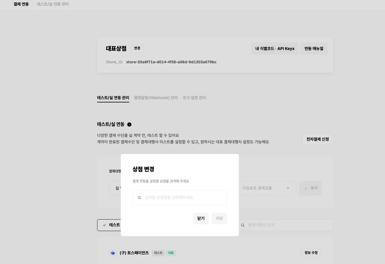 3. 결제 연동에서 별도로 웹훅을 설정할 하위상점으로 변경