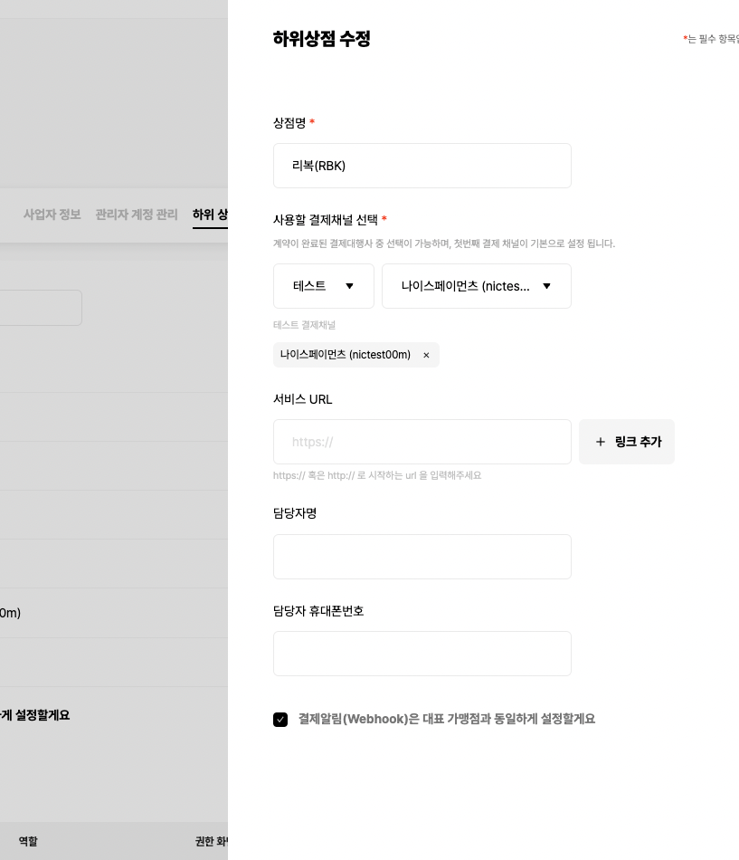 하위상점 수정에서 결제알림 동일 설정 옵션을 해제하면 하위상점별 웹훅 설정을 할 수 있습니다.