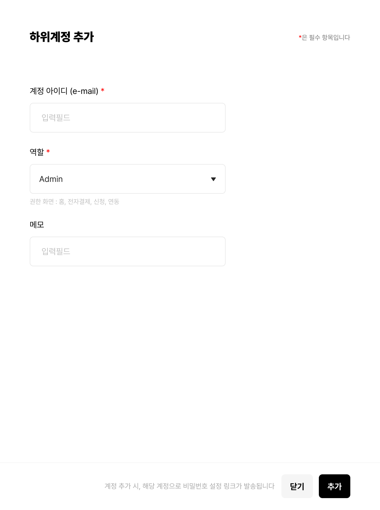 • 하위 상점 매니저 계정(Manager) : Owner 또는 Admin 또는 하위 상점의 Manager가 생성할 수 있습니다.