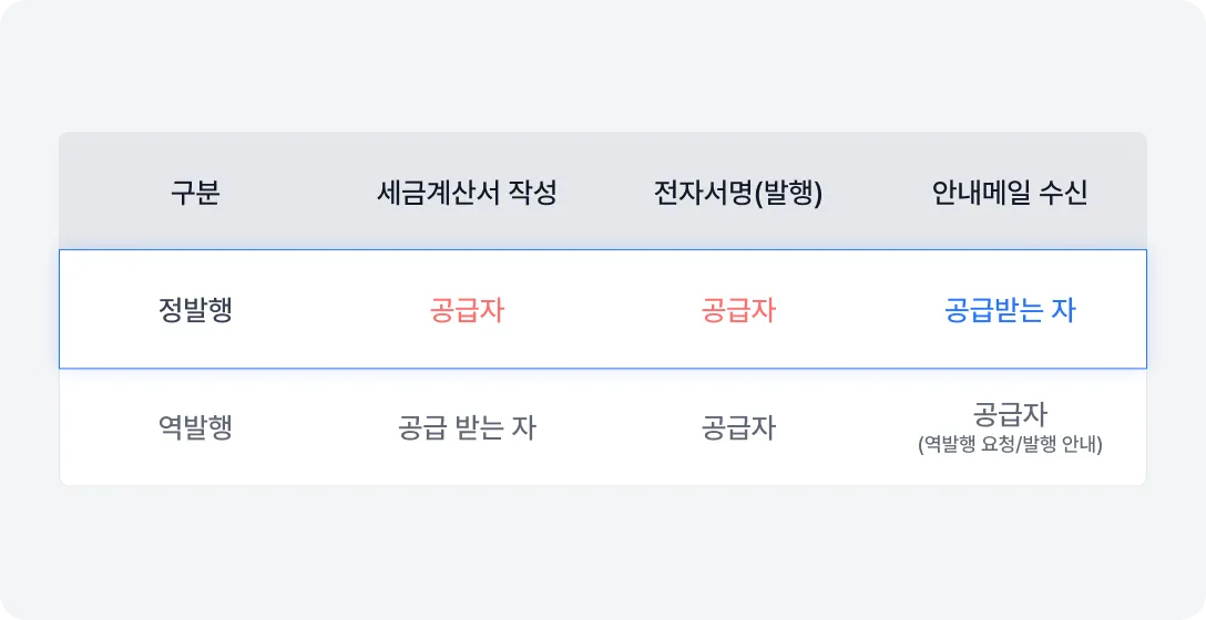 기존 역발행 건과 정발행 건의 자연스러운 통합을 위해 세금계산서 내역 관리 페이지에 발행 유형 필터가 추가됩니다. 세금계산서 내역 테이블 내 사업자 정보 컬럼이 기존 공급자 정보에서 거래처(공급자/공급받는자) 정보로 변경되어 역발행의 경우 공급자, 정발행의 경우 공급받는자 정보가 표기됩니다.