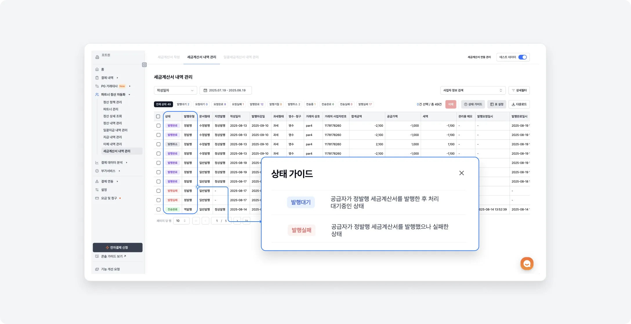 이제, 역발행 뿐 아니라 정발행 기능을 콘솔에서 사용할 수 있습니다. 단건 발행 및 일괄 발행으로 정발행 세금계산서를 발행할 수 있게 되어 정산뿐만 아니라 모든 거래에 대한 세금계산서 커버가 가능해집니다.